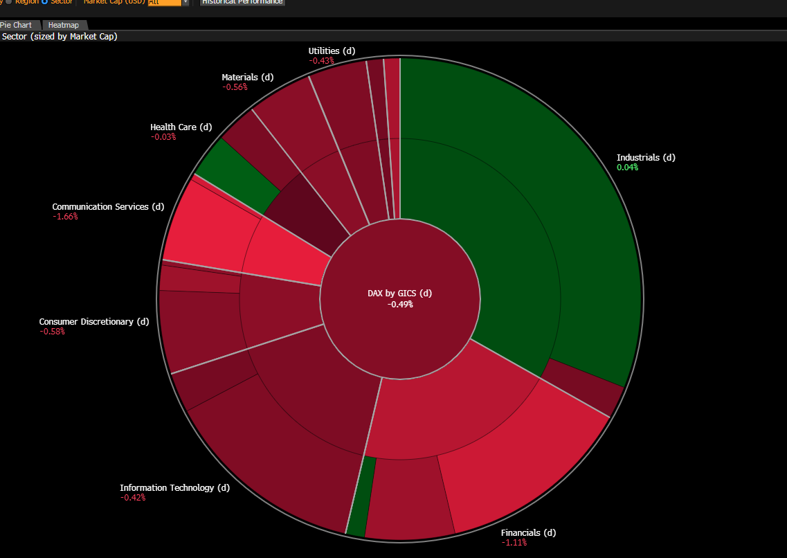 Na německém indexu pozorujeme širokou korekci, která značí celkové zhoršení sentimentu. Nejvíce ztrácejí komunikační služby a banky, a to v důsledku negativních informací z jednotlivých společností a obav o výsledky v sektoru. Lépe si vede průmysl, podpořený stále silným obranným průmyslem.