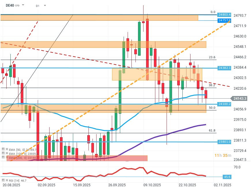 Graf ukazuje pokračující sestupnou korekci a tvorbu konsolidačního kanálu v pásmu FIBO 23,6–50. Cena prorazila podporu na úrovni 24 300 bodů a klouzavý průměr EMA50, což značí krátkodobou slabost kupců. Aby se zabránilo prohloubení korekce, musí kupci udržet podpůrnou zónu kolem 24 000. Iniciativu přebírající prodejci mohou stlačit cenu až k úrovni 23 900, kde se nachází úroveň FIBO 61,8 a EMA100.