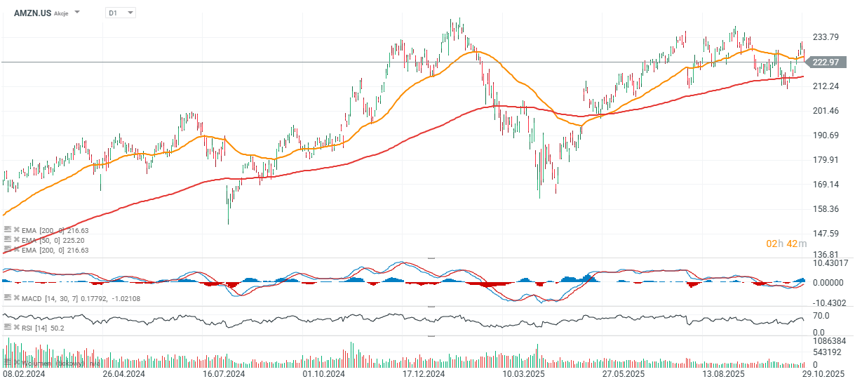 Akcie Amazonu vzrostly o více než 1,5 % v první den akce Prime Big Deal Day, zatímco Nasdaq 100 přidal 1,1 % a S&P 500 vzrostl o 0,5 %. To může odrážet rostoucí optimismus ohledně možného zlepšení e‑commerce před klíčovým svátečním čtvrtletím.