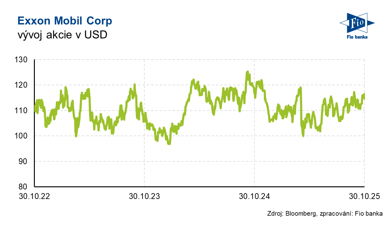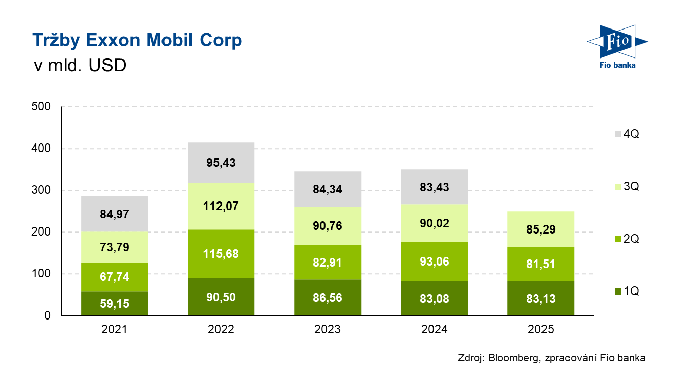 Ropný gigant Exxon Mobil reportoval výsledky hospodaření za 3. čtvrtletí roku 2025. Společnost za dané období vykázala tržby a ostatní příjmy ve výši 85,29 mld. USD, tedy nad průměrným odhadem analytiků 83,60 mld. USD. Zároveň oznámila zvýšení čtvrtletní dividendy o 4 % na 1,03 USD na akcii.