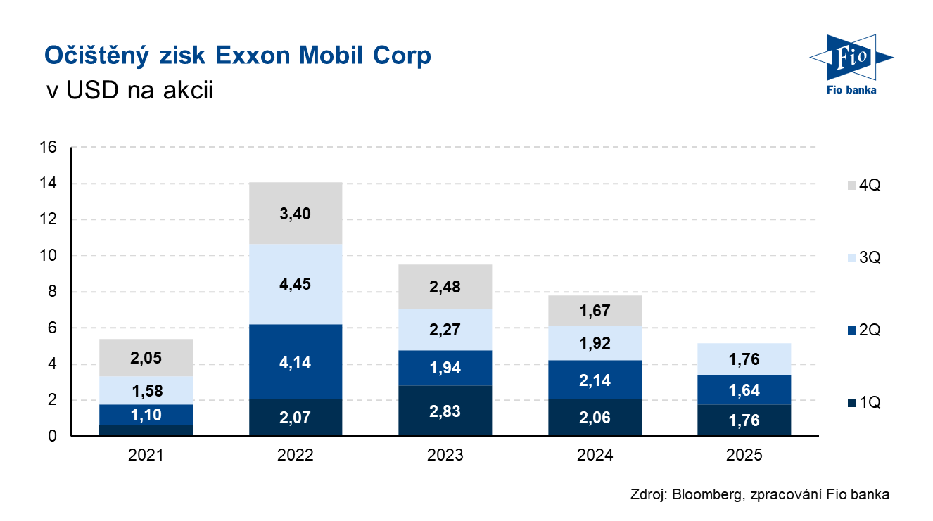 Exxon Mobil, největší producent ropy v USA, oznámil za druhé čtvrtletí upravený zisk ve výši 7,1 miliardy USD, tedy 1,64 USD na akcii, čímž překonal tržní očekávání (1,56 USD). Úspěchu dosáhl i přesto, že ceny ropy ve čtvrtletí klesly o 11 %, zejména vlivem zvýšení produkce ze strany OPEC+ a obav z globálních dopadů nových celních hrozeb prezidenta Trumpa.