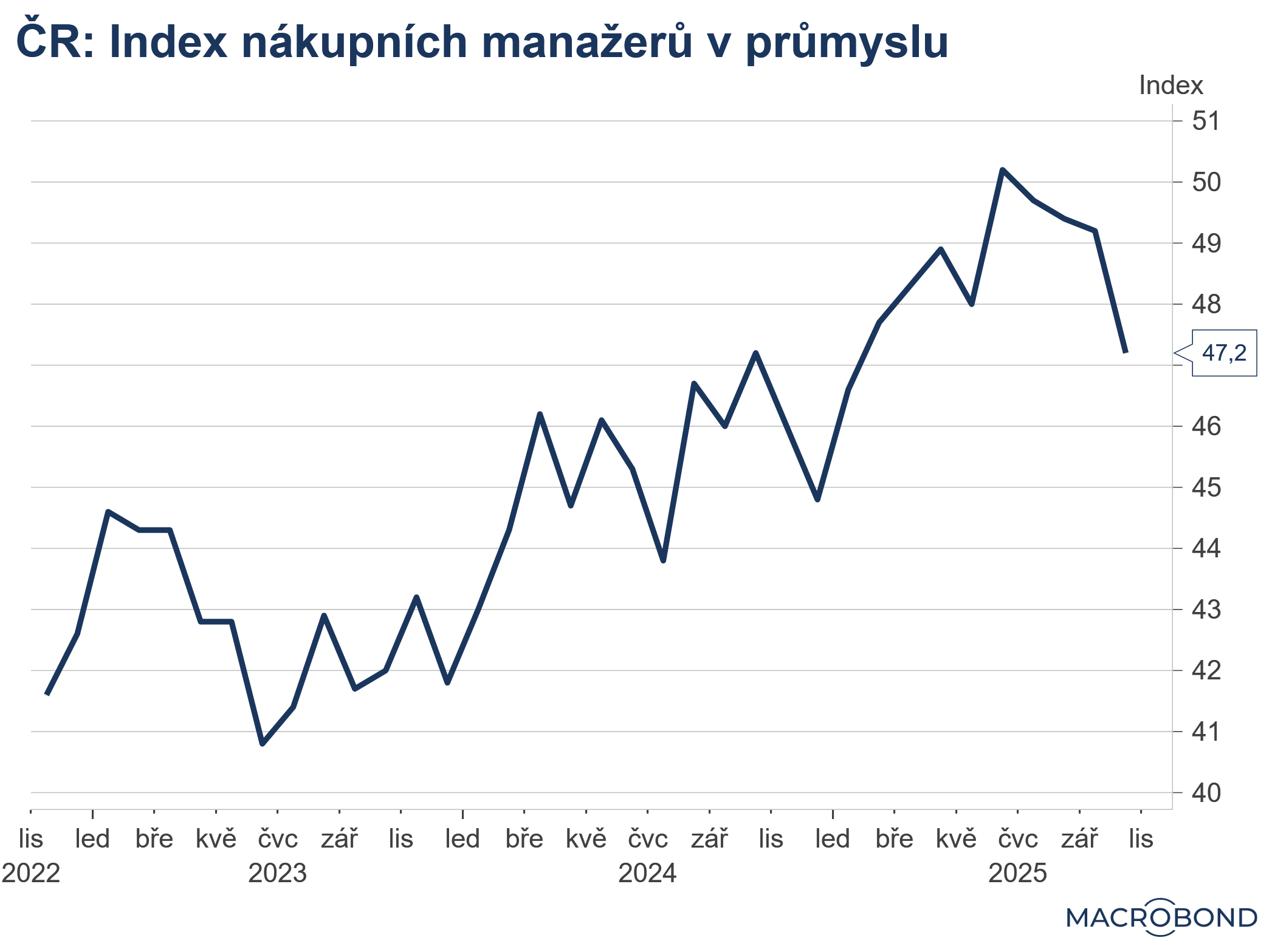 Index nákupních manažerů v průmyslu v říjnu výrazně klesl na 47,2 b. oproti 49,2 b. v září. Trhy očekávaly růst na 49,5 b.