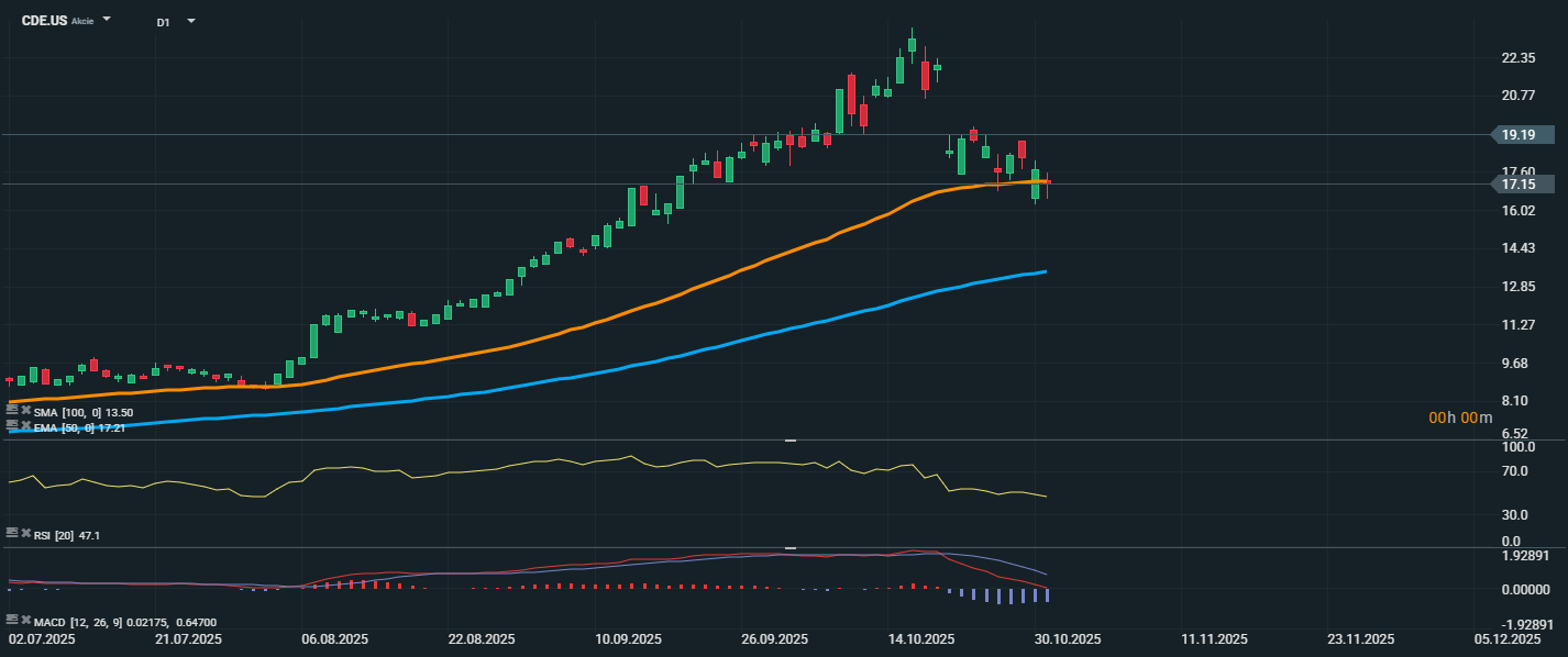 Akcie společnosti Coeur Mining po dosažení maxima poblíž 22 USD zaznamenaly výraznější korekci a aktuálně se obchodují u úrovně 17,15 USD, což odpovídá blízkosti EMA 50 (17,21 USD). Tato hladina může sloužit jako krátkodobá technická podpora, přičemž SMA 100 (13,50 USD) leží výrazně níže a naznačuje předchozí silný růstový trend.