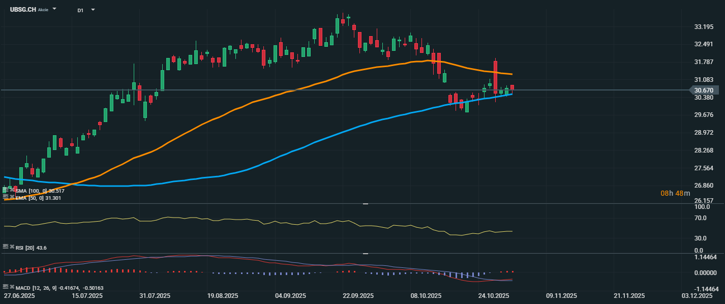 Akcie švýcarské banky UBS se po období poklesu stabilizovaly kolem úrovně 30,67 CHF, kde se nachází i důležitá technická zóna – klouzavý průměr SMA 100 (30,52 CHF). Cena se aktuálně pohybuje těsně pod 50denním EMA (31,30 CHF), což z ní činí významnou rezistenci v krátkodobém horizontu. RSI na hodnotě 43,6 značí slabé momentum a ukazuje, že trh zatím neprojevuje silný nákupní zájem.