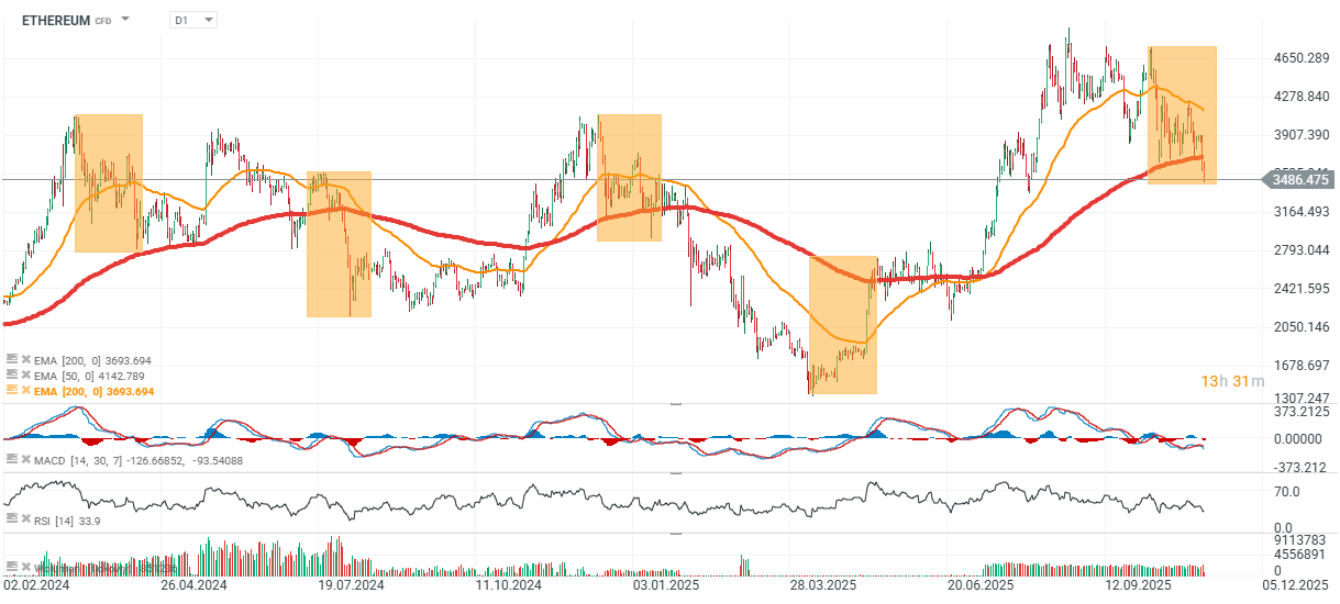 Ethereum je v současné době pod tlakem, ale na základě historických cenových impulsů můžeme opatrně předpokládat, že geometrie trhu podporuje alespoň konsolidační fázi po nedávném poklesu. Historicky však poklesy pod 200denní EMA téměř vždy vedly k hlubším výprodejům ETH než ten současný. K udržení býčího trendu by bylo nutné rychlé oživení nad 3 700 USD. V opačném případě by obnovený tlak mohl cenu vrátit zpět k 2 500 USD a vymazat tak letní vzestupný pohyb.