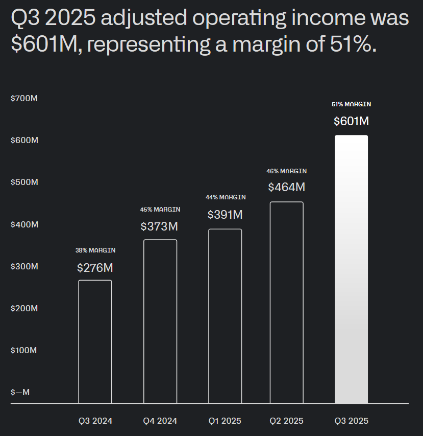 Očištěný provozní zisk zaznamenal meziroční růst o 51 % na 600,5 mil. USD při očekávání 498,7 mil. USD. Očištěná provozní marže zaznamenala meziroční nárůst o 13 p. b. na 51 %. Konsensus byl ve výši 45,8 %.