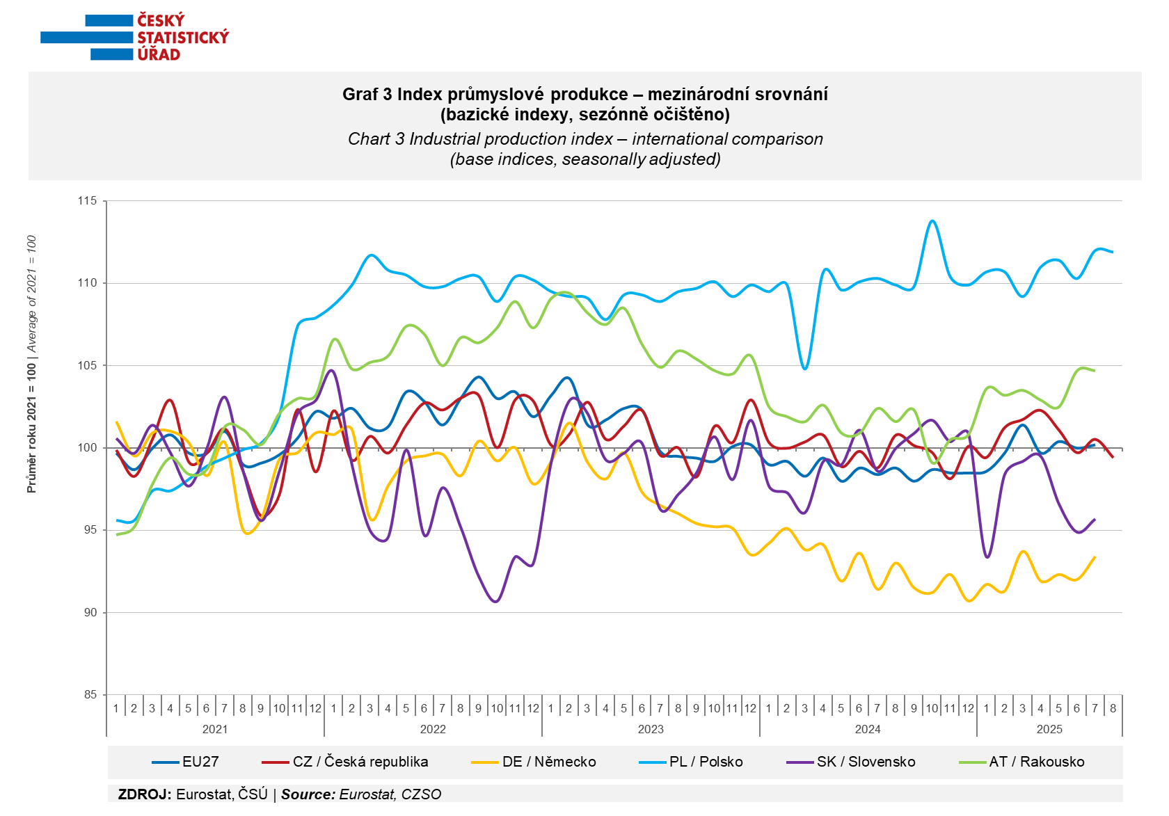 Od té doby se dá říci, že průmyslová produkce fakticky stagnuje. Dokonce ani nejnovější data (srpen 2025) nepřinesla dramaticky jiný obrázek. Nejvýše se střídají měsíce, kdy průmyslová produkce vzroste, aby v dalším měsíci opět klesla, patrná je tedy oscilace kolem úrovně srovnatelné s dobou před příchodem covidové pandemie.