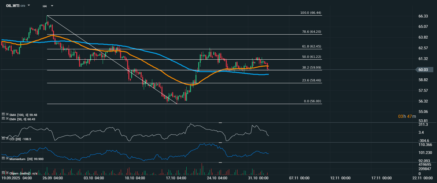 Z pohledu Fibonacciho retracementu zůstává zásadní úroveň 61,22 USD (50 % retracement) jako střednědobá rezistence. V případě pokračujícího poklesu by další důležitá podpora mohla ležet na 58,46 USD (23,6 %), jejíž prolomení by otevřelo prostor pro návrat až k říjnovým minimům u 56 USD.
