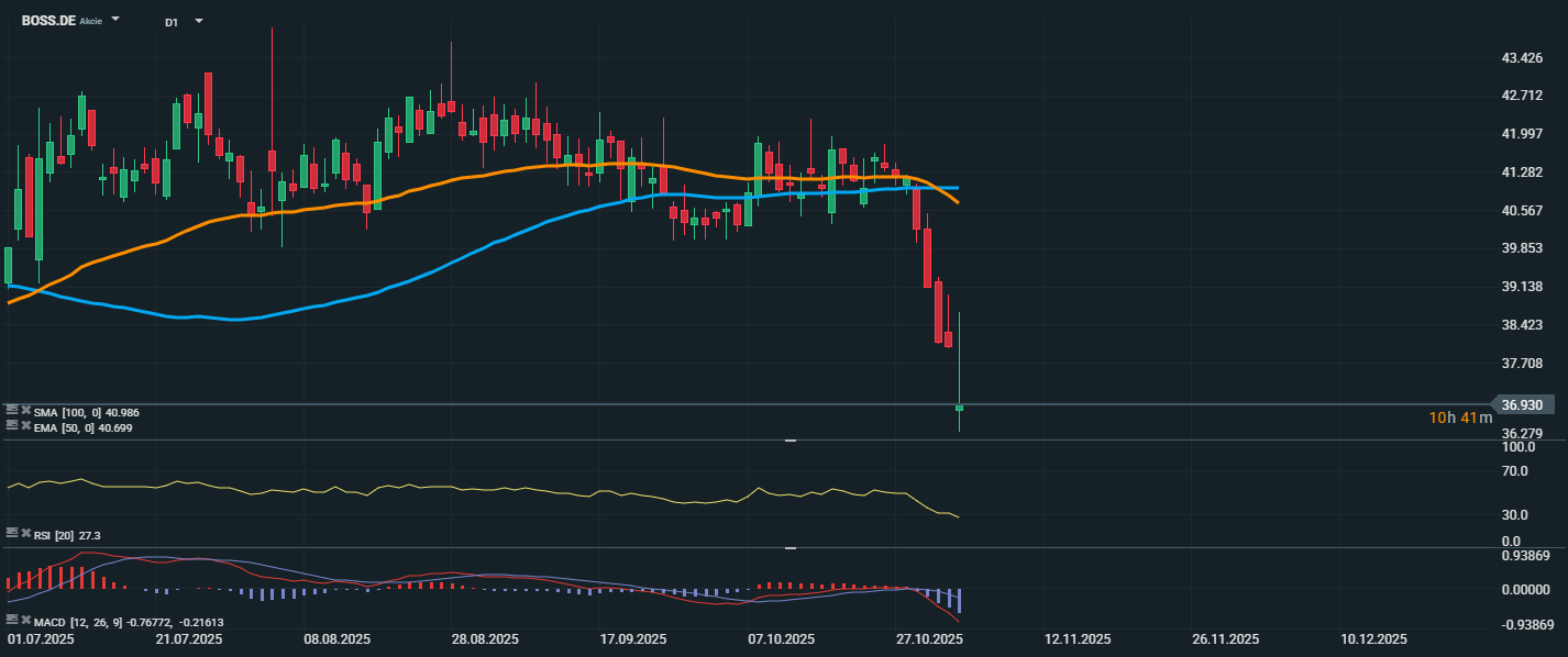 Akcie Hugo Boss se po zveřejnění horších kvartálních výsledků dostaly pod silný prodejní tlak a zaznamenaly výrazný propad. Cena se aktuálně obchoduje u 36,93 EUR, což představuje výrazný pokles oproti předchozím úrovním nad 40 EUR. Trh tak jednoznačně reaguje na zklamání z vývoje tržeb a slabší výhled firmy pro zbytek roku. Akcie se prudce propadly pod oba klíčové klouzavé průměry – SMA 100 (40,99 EUR) i EMA 50 (40,70 EUR) – čímž byl potvrzen obrat do sestupného trendu. RSI spadl na 27,3, což značí, že akcie se nacházejí v hluboce přeprodaném pásmu, a může tak dojít k technickému odrazu nebo krátkodobému výdechu.