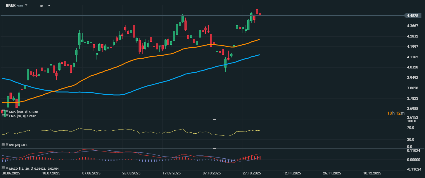 Akcie společnosti BP pokračují v růstovém trendu a aktuálně se obchodují v blízkosti rezistence na úrovni 4,45 GBP, což představuje lokální maximum. Cena se pevně drží nad klouzavými průměry EMA 50 (4,26 GBP) a SMA 100 (4,14 GBP), což potvrzuje býčí technické nastavení. RSI (60,3) se nachází v neutrálně pozitivním pásmu, tedy bez známek překoupenosti, což ponechává prostor pro další růst. Také MACD zůstává v pozitivní zóně a histogram indikuje sílící momentum, i když zatím bez přehřátí trhu.