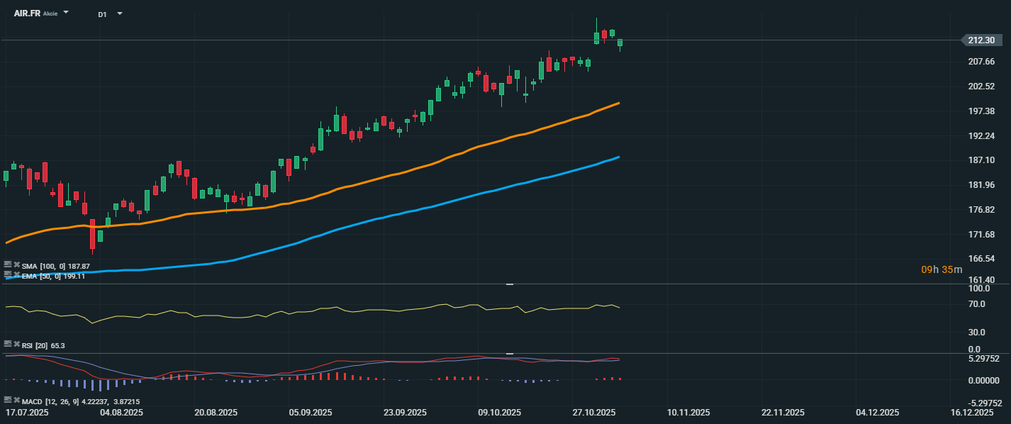 Akcie společnosti Airbus pokračují v jasně býčím trendu a aktuálně se obchodují na úrovni 212,30 EUR, tedy v blízkosti maxima. Trh vykazuje stabilní růstový kanál, a to jak v cenové akci, tak i v klouzavých průměrech. Cena se pevně drží nad EMA 50 (199,11 EUR) i SMA 100 (187,87 EUR), přičemž oba průměry rostou a podporují uptrend. RSI je na hodnotě 65,3, což naznačuje silné nákupní momentum, ale zároveň již přibližuje hranici překoupenosti (70) – trh tak může být náchylný ke krátkodobé konsolidaci nebo mírné korekci.