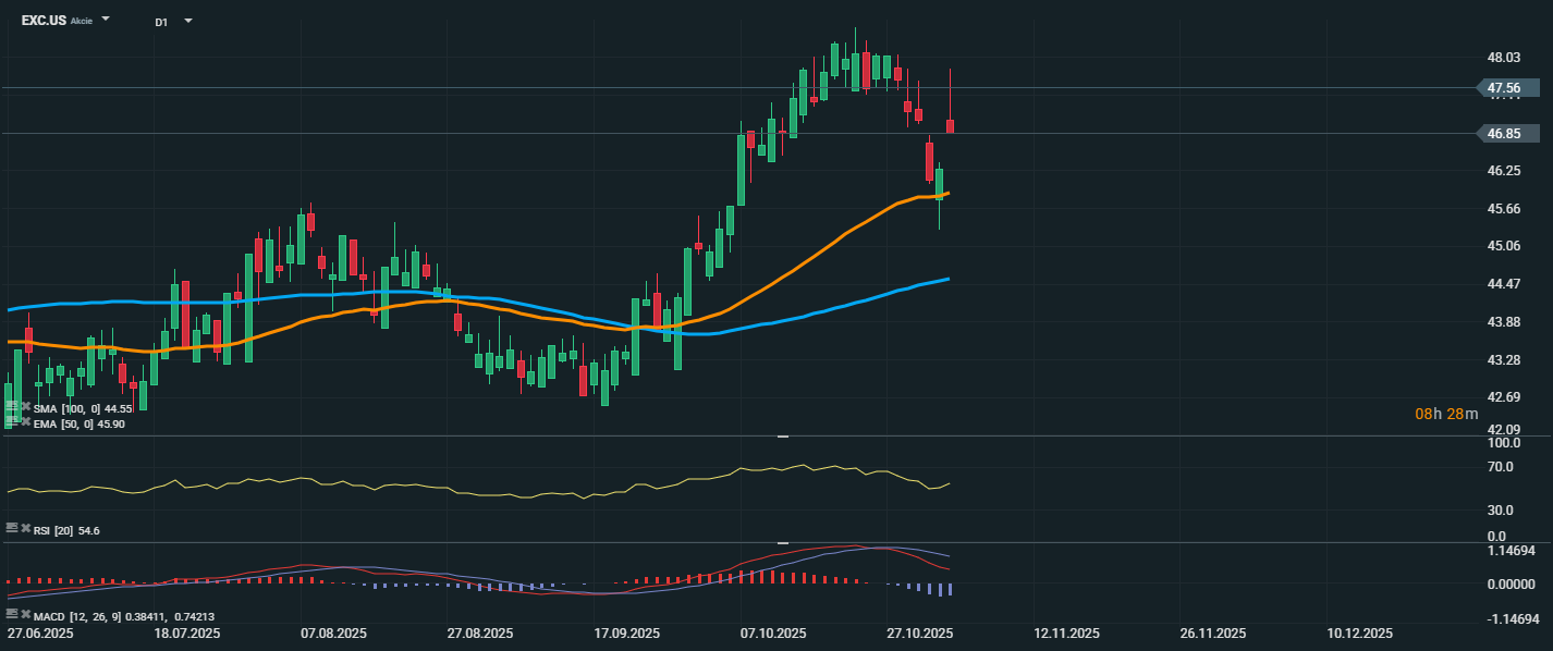 Akcie společnosti Exelon po dosažení lokálního vrcholu u 47,56 USD zaznamenaly korekci, která je aktuálně bržděna na úrovni klouzavého průměru EMA 50 (45,90 USD). Tato hladina zatím slouží jako krátkodobá podpora, i když dnešní svíčka ukazuje na pokračující nejistotu a zvýšenou volatilitu. SMA 100 (44,55 USD) zůstává jako silnější střednědobá podpora, a pokud by EMA 50 byla prolomena, mohla by být dalším cílem trhu. RSI se nachází na 54,6, což značí neutrální technický stav – akcie nejsou ani překoupené, ani přeprodané, což zanechává prostor pro další pohyb oběma směry.