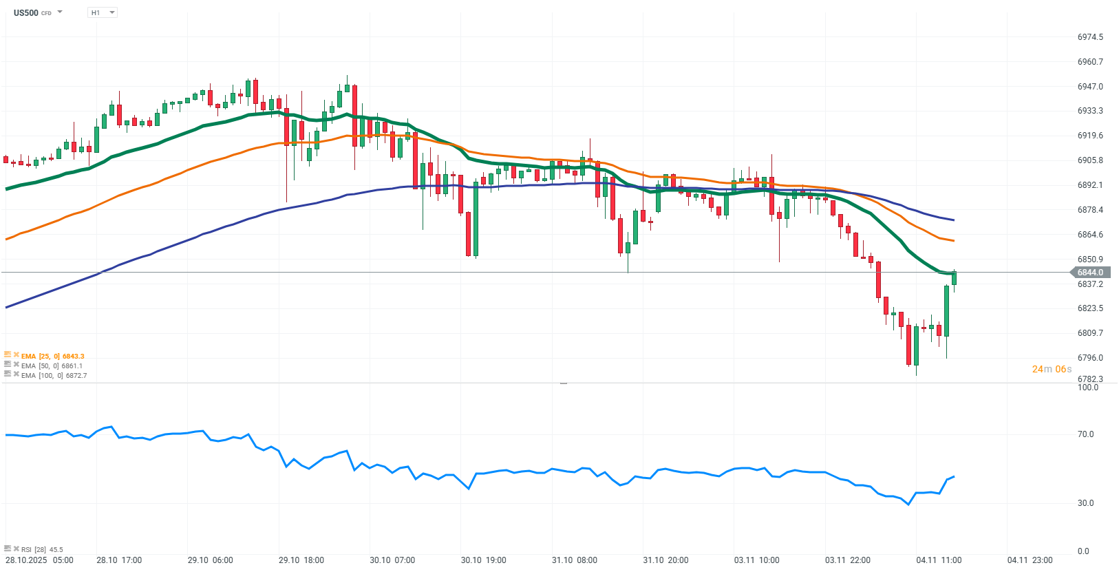 Futures na S&P 500 oslabují, což signalizuje krátkodobou korekci v rámci širšího downtrendu. Opatrnost investorů je patrná – odráží makroekonomickou nejistotu a očekávání výsledků technologických firem, které v posledních týdnech výrazně ovlivňovaly tržní sentiment. Z technického pohledu krátkodobé oživení nepřekonalo významné úrovně rezistence ani klouzavé průměry, což ukazuje, že tlak na straně nabídky zůstává silný. Aktuální nálada na trhu poukazuje na zvýšenou averzi k riziku a směr indexu v dalších dnech může určit nadcházející zveřejnění makrodat a výsledků firem.