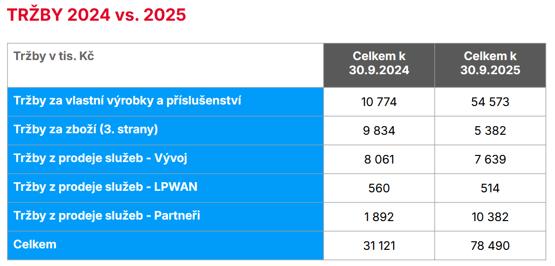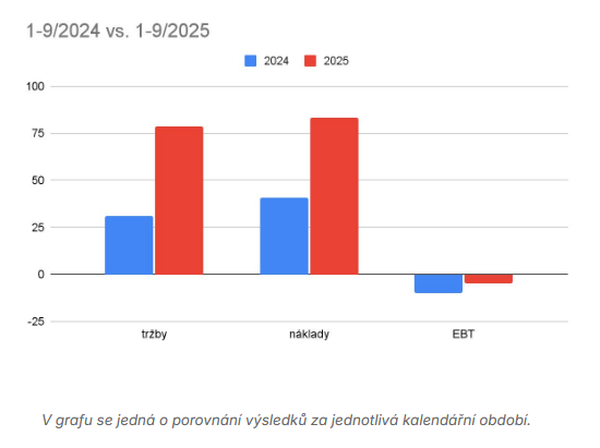 Společnost za 9M roku dosáhla tržeb ve výši 78,49 mil. Kč (9M 2024: 31,12 mil. Kč).