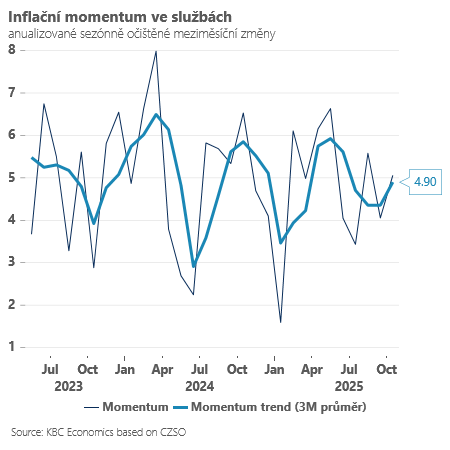 Ostatní části spotřebitelského koše se na první pohled vyvíjí podle očekávání – podle předpokladu lehce zlevnily ceny energií a v souladu s odhady je i dynamika cen zboží. Na druhou stranu bez povšimnutí v ČNB nezůstane, že se zastavuje zvolňování zvýšeného inflačního momenta ve službách (kterého jsme byli svědky v uplynulých měsících) - viz graf níže.