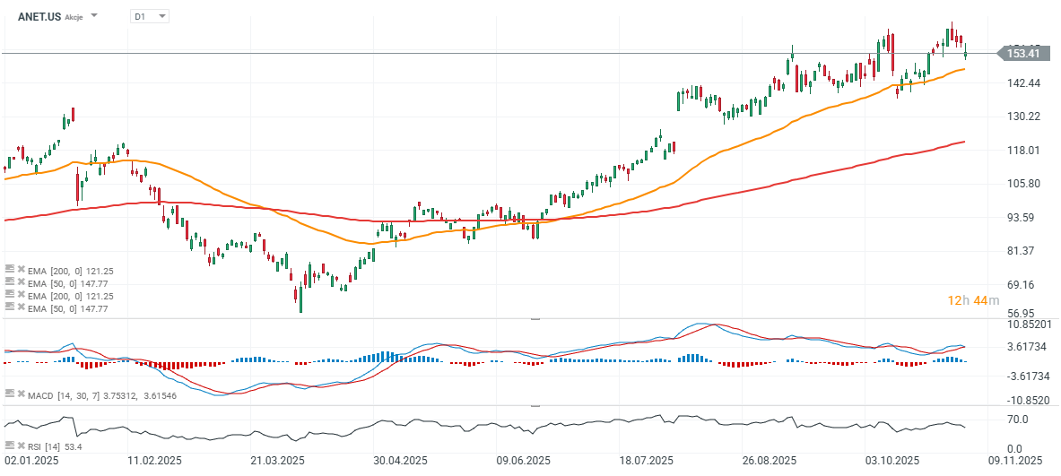 Navzdory lepším tržbám a zisku v Q3 2025 akcie Arista Networks (ANET.US) — lídra v oblasti síťových přepínačů a softwaru pro datová centra — v úvodní reakci trhu klesly přibližně o 12 %. Níže jsou klíčové body z výsledků za třetí čtvrtletí 2025. Od začátku roku akcie vzrostly o více než 40 %, přičemž od dubnového minima si připsaly téměř 60 %. Pokles odráží opatrný a víceméně v souladu zveřejněný výhled pro aktuální čtvrtletí a mírně nižší očekávání marží.