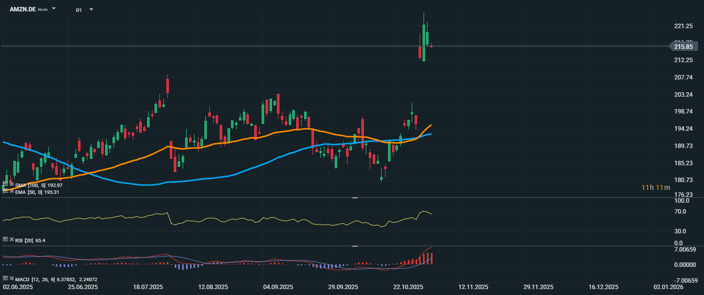 Akcie společnosti Amazon zaznamenaly v posledních dnech prudký růst a aktuálně se obchodují na úrovni 215,85 EUR. Z technického pohledu cena výrazně překonala klouzavé průměry SMA 100 (192,97 EUR) a EMA 50 (195,31 EUR), což potvrzuje býčí trend. RSI se nachází na hodnotě 65,4, tedy těsně pod hranicí překoupenosti (70), což naznačuje, že trh má ještě určitý prostor pro další růst, i když tempo může být mírně zpomaleno. MACD zůstává v kladném teritoriu a ukazuje silné rostoucí momentum, přestože histogram naznačuje mírné zpomalení v posledních dnech – což může být důsledek krátkodobé konsolidace po prudkém růstu.