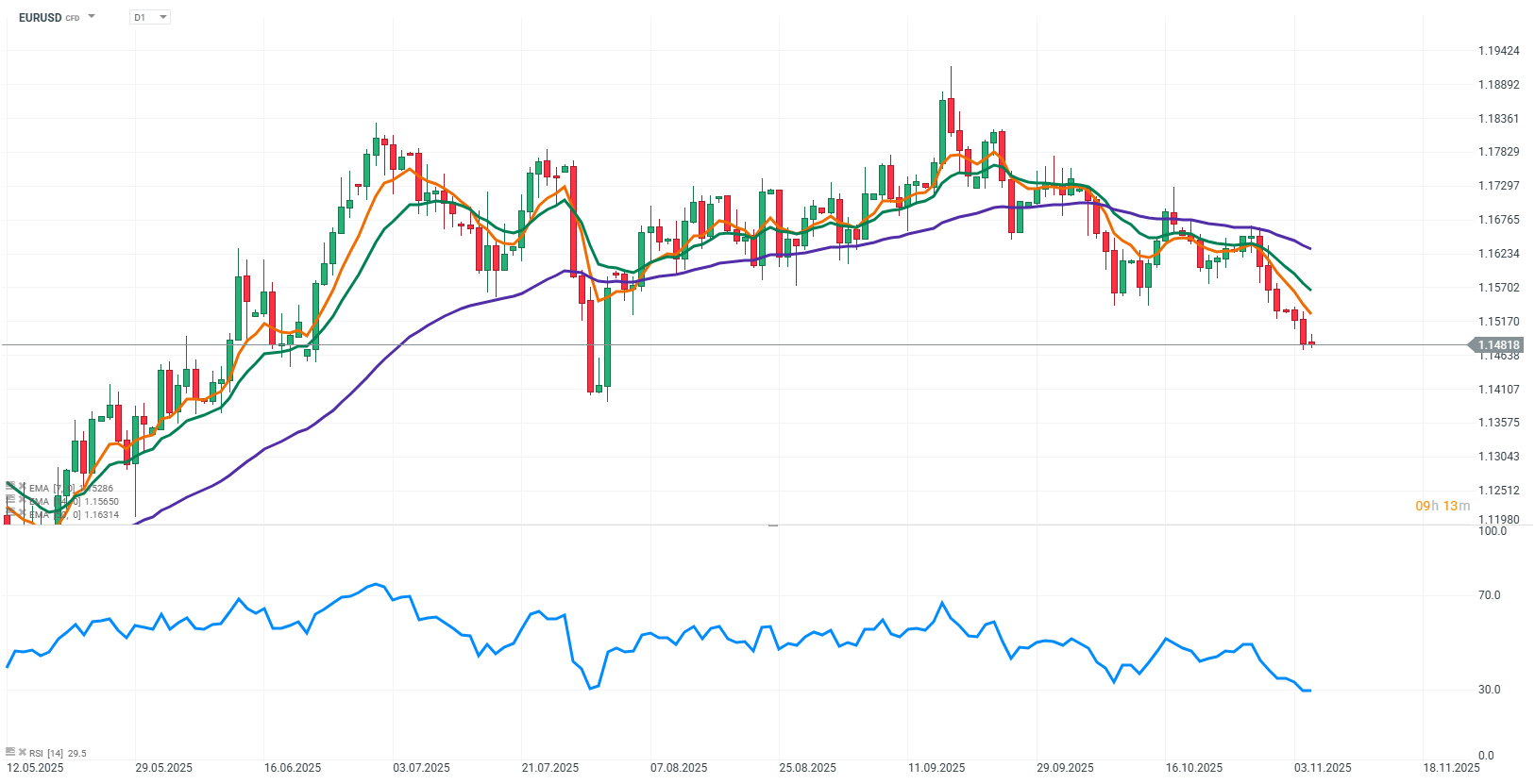 Od včerejška došlo ke korekci technologických akcií, což vedlo investory k odlivu kapitálu z rizikovějších aktiv. Výsledkem je příliv prostředků do bezpečných aktiv, jako je dolar, který tak získává další podporu – a to se odráží na kurzu EUR/USD.