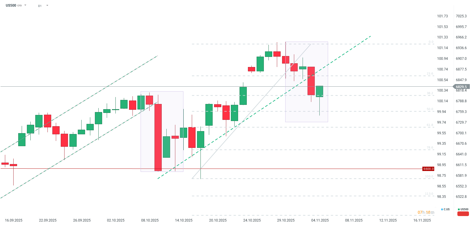 Index US500 pokračoval v prudkém poklesu během asijské seance, po volatilním dni poznamenaném smíšenými firemními výsledky – slabé výsledky SMCI a mírné zklamání od Arista způsobily výrazné poklesy, které byly částečně vyváženy solidními výsledky AMD. Dnešní odraz pokračuje v návaznosti na lepší než očekávaná makrodata z USA. Odraz od 50,0% Fibonacciho retracementu posledního hlavního uptrendu naznačuje, že základní býčí impulz zůstává zachován. Uzavření nad 6 800 body dnes by potvrdilo konec současné korekční fáze.