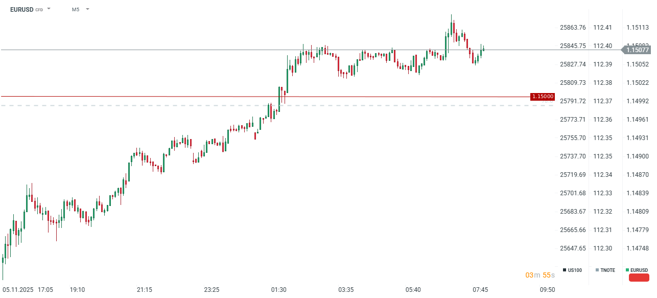 Údaje ukázaly, že průmyslová výroba v Německu se v září odrazila od dna mnohem méně, než se očekávalo, po obrovském poklesu v srpnu, který byl nejvyšší od března 2022. Z další zprávy vyplývá, že Německo má stále problémy s oživením jádrové ekonomiky. Je důležité poznamenat, že Německo zůstává světovým lídrem v průmyslové výrobě, což může ovlivnit ostatní ekonomiky. EURUSD ani DE40 na data nereagují. EUR/USD se stále nachází v blízkosti denního maxima nad úrovní 1,15: