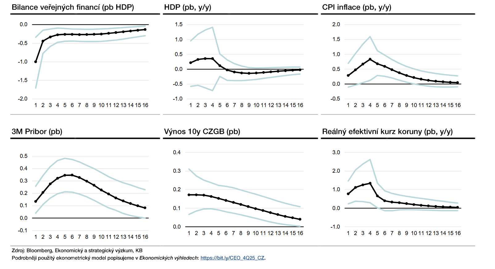 Významná je podle našeho odhadu naopak pozitivní odezva inflace. Ta se v návaznosti na uvolnění fiskální politiky zvyšuje v následujících dvou letech o zhruba 0,5 pb. Na zesílené inflační tlaky typicky reaguje i centrální banka, avšak v prvním roce po šoku zvýšením (případně nesnížením) úrokových sazeb pouze v rozsahu lehce překračujícím jeden standardní krok o 25 bb, tedy méně než činí nárůst inflace. Rozvolnění fiskální politiky se dle očekávání projevuje v prvním roce také v nárůstu výnosů státních dluhopisů o téměř 20 bb a v reálném zpevnění efektivního kurzu koruny o cca procento.