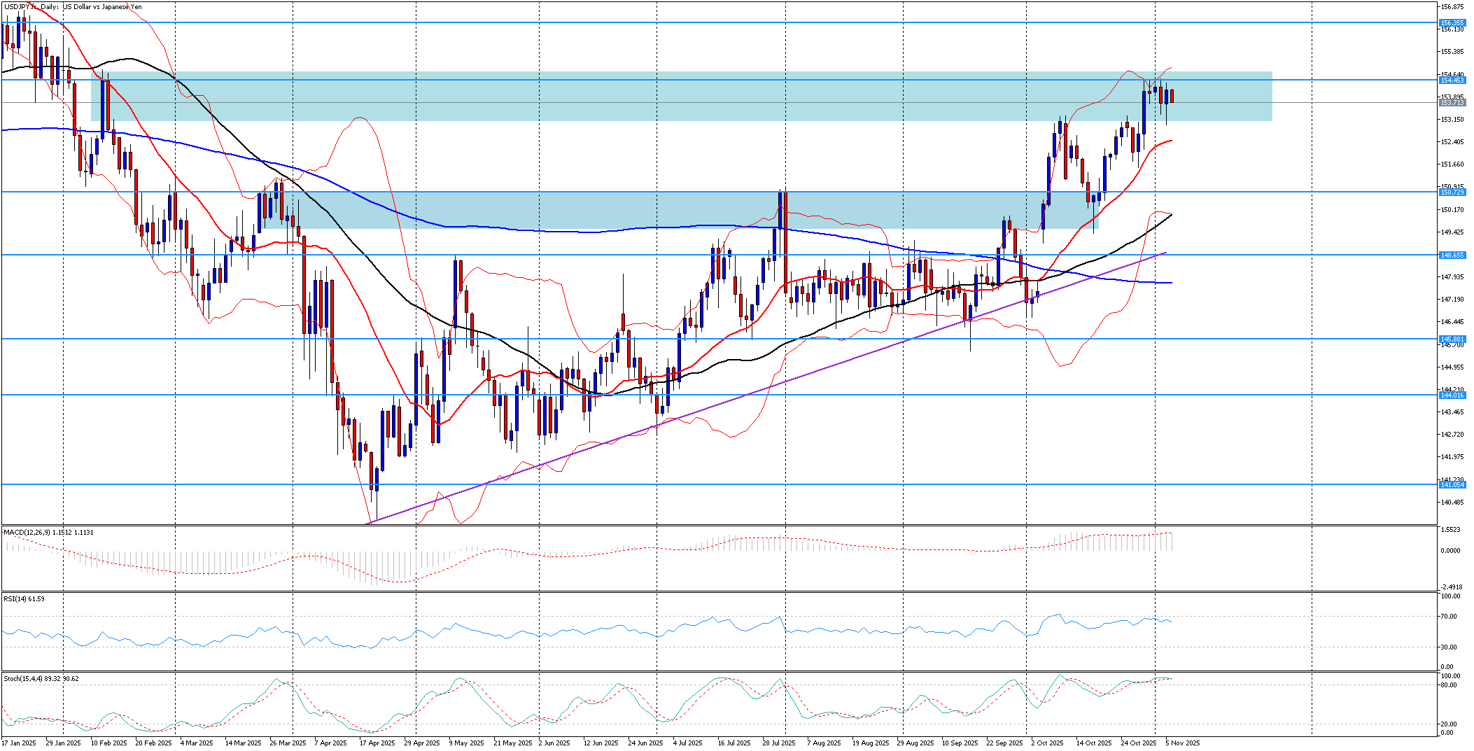 USD/JPY se aktuálně obchoduje těsně pod klíčovou hranicí 154,00, pod tlakem silnějších než očekávaných ekonomických údajů z USA a zdrženlivého postoje Federálního rezervního systému k budoucímu snižování sazeb. Zpráva ADP o zaměstnanosti ukázala vyšší počet nových pracovních míst v soukromém sektoru, zatímco index ISM Services PMI vystoupal na osmitýdenní maximum, což potvrzuje odolnost americké ekonomiky a podporuje sílu dolaru. Navzdory několika pokusům o prolomení devítiměsíčního maxima 154,47 a dosažení rezistence na 154,80 se pár zatím nedokázal udržet v růstovém trendu a vstoupil do fáze konsolidace. Jasný průlom nad 154,80 by mohl otevřít prostor pro pokračování růstu směrem k lednovým maximům v oblasti 156,70. Naopak pokles pod podporu 153,30 by mohl vyvolat korekci, přičemž 20denní jednoduchý klouzavý průměr (SMA) na úrovni 152,50 představuje první obrannou linii, následovanou další podporou na 151,50. Z technického pohledu se MACD pohybuje vodorovně nad nulovou linií, což naznačuje oslabení směrové síly. Stochastický oscilátor zároveň vytvořil medvědí křížení v překoupené zóně, což ukazuje na možnost krátkodobého ústupu. Celkově USD/JPY setrvává v úzkém rozmezí poblíž klíčové rezistence, přičemž trh může v nejbližších seancích projít fází konsolidace. Průlom nad 154,80 by potvrdil obnovení býčího momenta, zatímco pokles pod 153,30 by mohl naznačit začátek hlubší korekce.