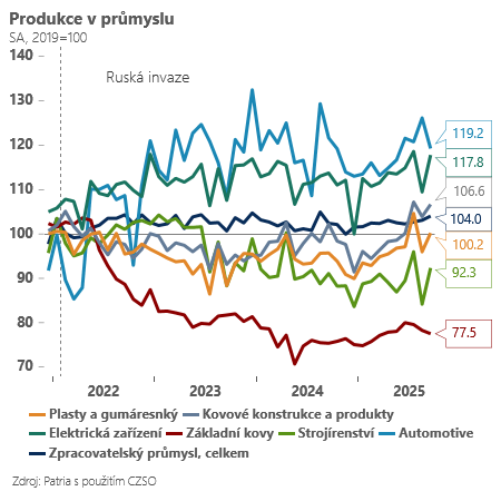 Při pohledu do struktury je dobrou zprávou, že se daří o něco lépe zpracovatelskému průmyslu a v roli dodatečných brzd působí spíše producenti energií a těžaři. Uvnitř zpracovatelského průmyslu však v posledních kvartálech zůstávají velké rozdíly mezi jednotlivými odvětvími. V posledních měsících ho táhne vpřed zejména výroba kovových konstrukcí, producenti plastů a gumárenský průmysl. Tato odvětví jsou více či méně napojena na automotive, který aktuálně sice stagnuje, ale podle sektorových průzkumů vykazuje vysoké využití výrobních kapacit (blízko 100 %) - což mimochodem ostře kontrastuje se situací v západní Evropě.