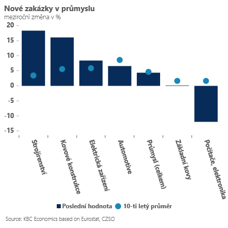 Setrvale také velmi slabý zůstává výkon producentů elektroniky a počítačového vybavení a značně nevyrovnaný je i vývoj v dalším páteřním odvětví - ve strojírenství. Tam však alespoň vidíme v posledních měsících vylepšení v oblasti nových objednávek.