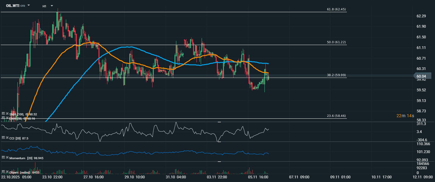 Cena ropy WTI se po včerejším poklesu snaží stabilizovat v blízkosti Fibonacciho hladiny 38,2 % na úrovni 59,99 USD, kde se aktuálně obchoduje za 60,04 USD. Tento cenový bod působí jako klíčová krátkodobá rezistence, neboť se zde rovněž nachází klouzavý průměr EMA 50 (60,18 USD), který byl v posledních dnech několikrát testován a odmítnut. Naopak klouzavý průměr SMA 100 (60,52 USD) se nachází ještě výše a potvrzuje přetrvávající sestupný trend, neboť cena zůstává pod oběma průměry. Pokud se ropě nepodaří tuto zónu překonat, hrozí návrat k úrovním kolem 58,46 USD, což odpovídá 23,6 % Fibonacciho retracementu.