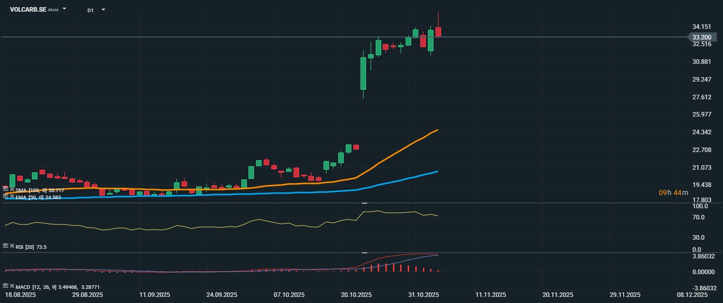 Akcie společnosti Volvo Cars zažily v posledních týdnech prudký růstový impulz, kdy se jejich cena vyšplhala až na aktuálních 33,20 SEK. Cena se nyní nachází výrazně nad oběma klouzavými průměry – EMA 50 (24,58 SEK) i SMA 100 (20,77 SEK), což potvrzuje silné býčí momentum. RSI dosáhl hodnoty 73,5, což signalizuje překoupenost trhu, a tedy možnou krátkodobou korekci. Přesto zatím nedochází k výraznému vybírání zisků a trh si udržuje pozitivní strukturu.