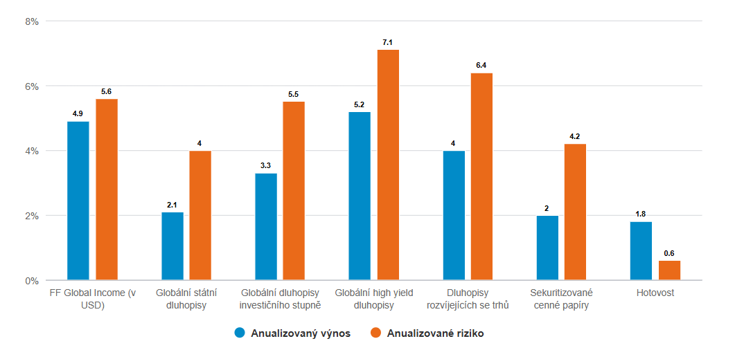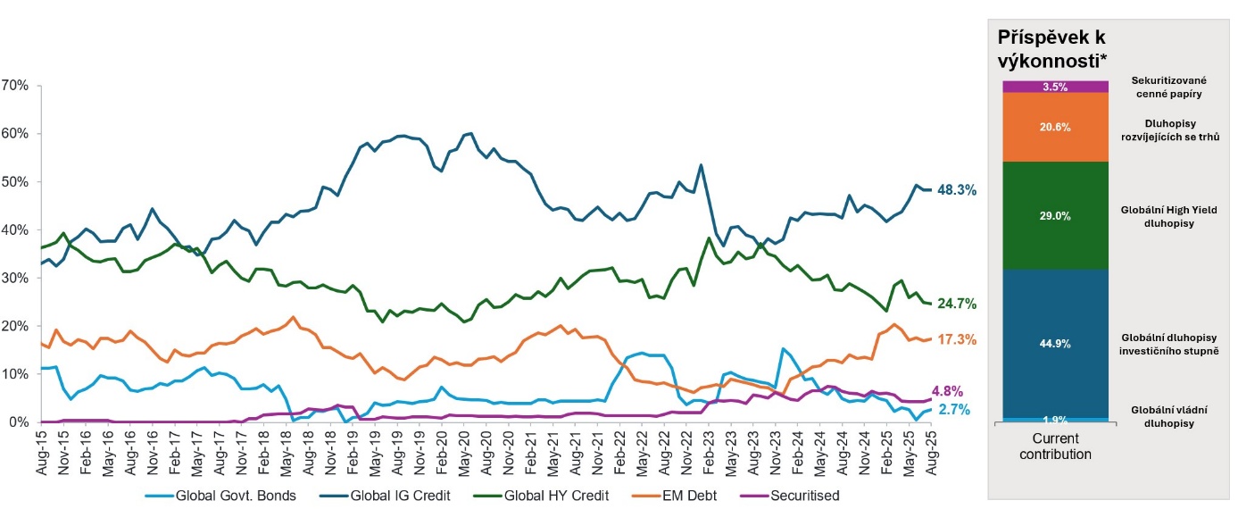 Zdroj: Fidelity International, Bloomberg, 31. srpna 2025.**Výkonnost odráží akcie FF Global Income A-MINCOME(G)-USD Hedged, nav-nav s reinvestovaným výnosem, před odečtením poplatků (roční náklady činí 1,32 % pro akcie třídy A a 0,80 % pro akcie třídy Y) – na základě měsíčních dat od 31. ledna 2014 (třída akcií byla zavedena 10. ledna 2014). Reference ICE BofA indexy (uvedené pouze pro ilustrační účely); globální státní dluhopisy = ICE BofA Global Government Index („W0G1“), globální dluhopisy investičního stupně = ICE BofA Global Corporate Index („G0BC“), globální high yield dluhopisy = ICE BofA Global High Yield Constrained Index („HW0C“), dluhopisy rozvíjejících se trhů = ICE BofA US Emerging Markets Liquid Corporate Plus Index („EMCL“), sekuritizované cenné papíry = ICE BofA Global Collateralized Index („G0BL“), hotovost = ICE BofA SOFR Overnight Rate Index („L0US“) – na základě měsíčních dat zajištěných do USD od 31. ledna 2014.