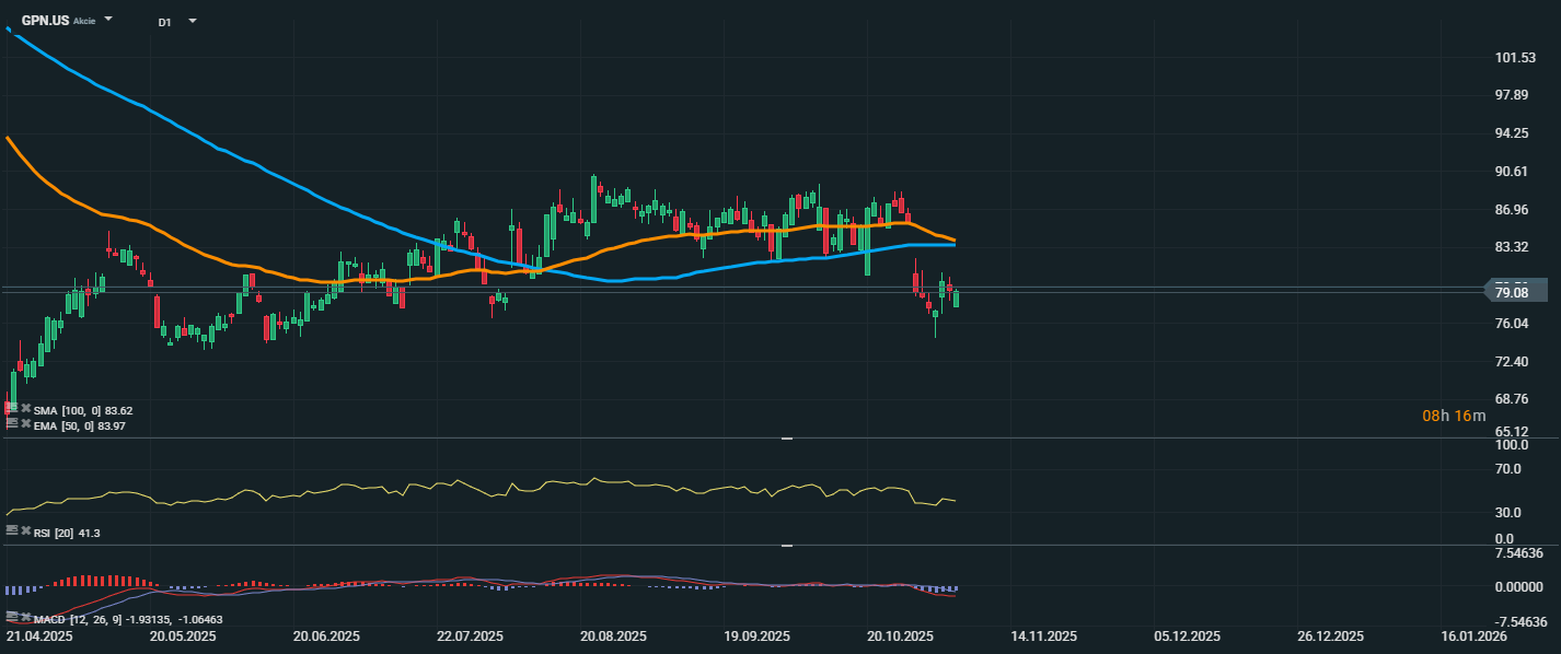 Akcie společnosti Global Payments se aktuálně obchodují za 79,08 USD, přičemž v posledních dnech došlo k výraznějšímu poklesu. Cena se propadla pod oba klouzavé průměry – EMA 50 (83,97 USD) a SMA 100 (83,62 USD). RSI dosahuje hodnoty 41,3, což značí slábnoucí momentum bez přeprodanosti, a naznačuje, že trh stále může pokračovat v mírném oslabování.