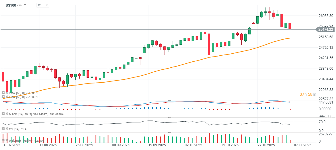Dnes se US100 přiblížil o krok blíže k testování klouzavého průměru EMA50 (oranžová čára) poblíž 25 000 bodů.