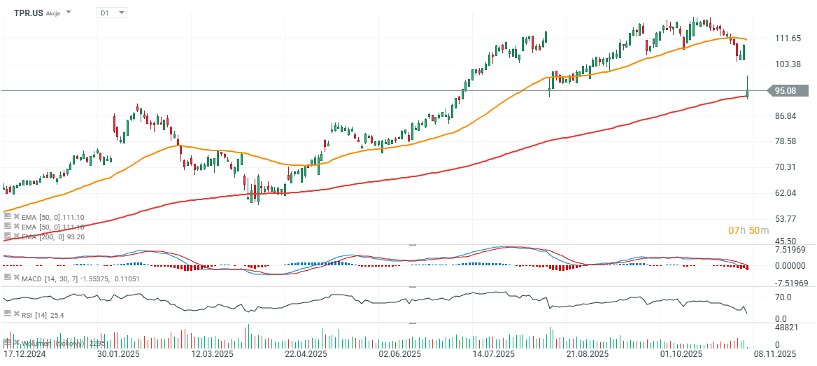 Akcie Tapestry (TPR.US) klesly téměř o 8 % poté, co zvýšený celoroční výhled EPS výrobce kabelek nesplnil očekávání trhu. Pokles se zastavil v klíčové oblasti podpory poblíž 94 USD za akcii, kde se aktuálně nachází EMA200 (červená čára).