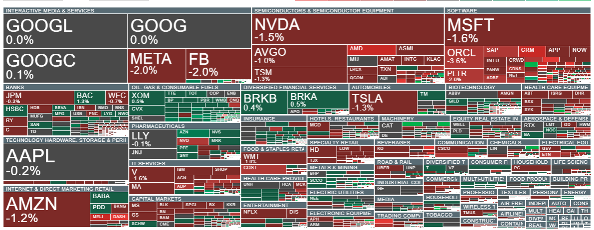 Akcie technologických společností – od softwarových firem jako Oracle a Salesforce po giganty v oblasti polovodičů jako Nvidia a AMD – dnes výrazně klesají. Mezitím si energetický sektor vede o něco lépe, podporován postupným oživením cen ropy.