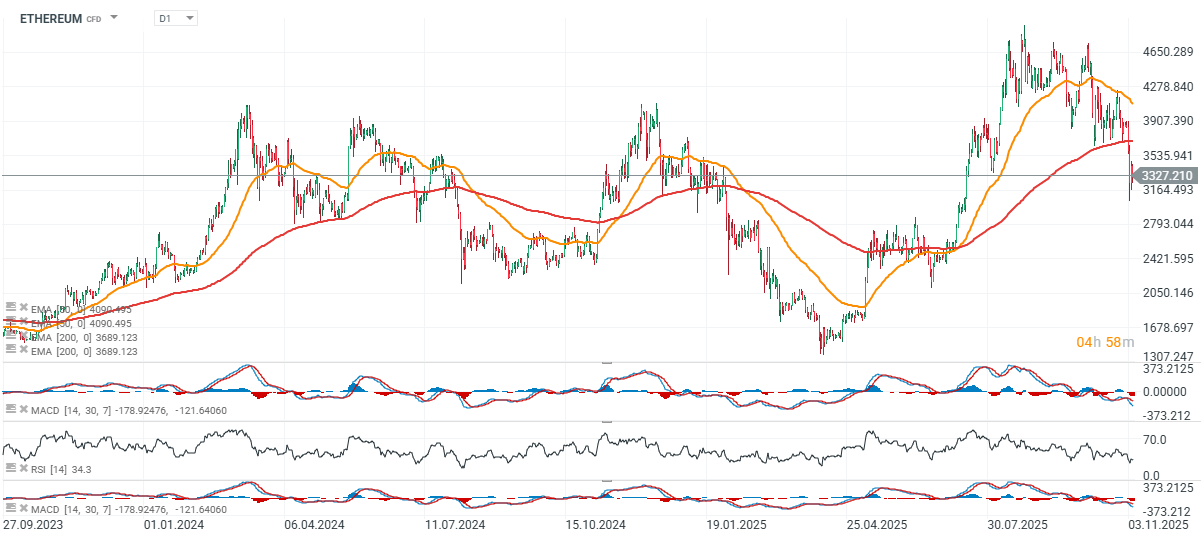 Současný sestupný impuls Etherea připomíná pokles z června 2025, kdy se cena propadla z téměř 2 900 USD na necelých 2 100 USD, než v létě vystoupala zpět k 4 900 USD.