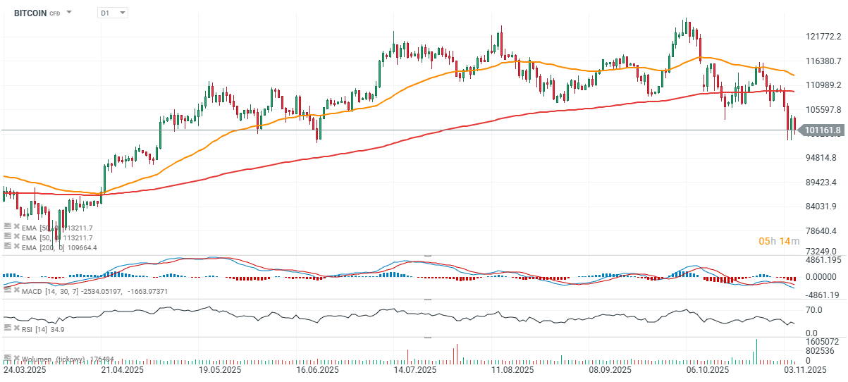 Bitcoin včera krátce klesl pod hranici 100 000 USD, a dnes ustoupil z úrovně kolem 104 000 USD na necelých 101 000 USD. Tento pohyb obnovil obavy, že by mohl být otestován support u 92 000 USD — nevyplněný CME gap, než se trh pokusí o další růst.