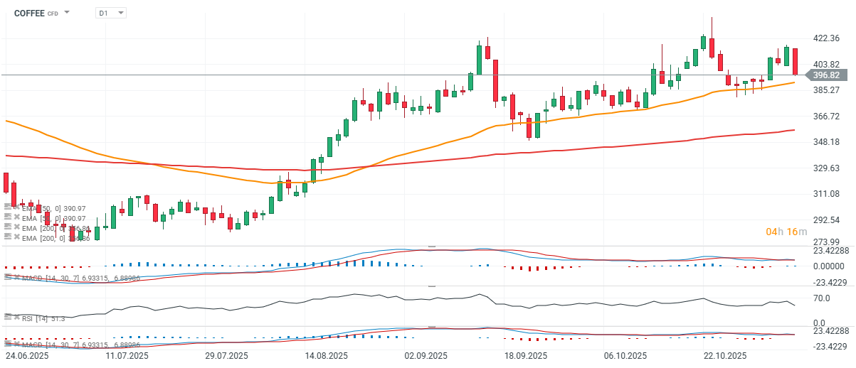 Futures na kávu dnes připisují téměř 5% zisky a poprvé od 17. září prorazily hranici 400 centů za libru. Silné býčí momentum bylo patrné již během včerejší seance, kdy trh reagoval na přetrvávající obavy z nedostatečných srážek v Brazílii. Nízké srážky během klíčového období květu stromů ohrožují produkční výhled na příští sezónu. -