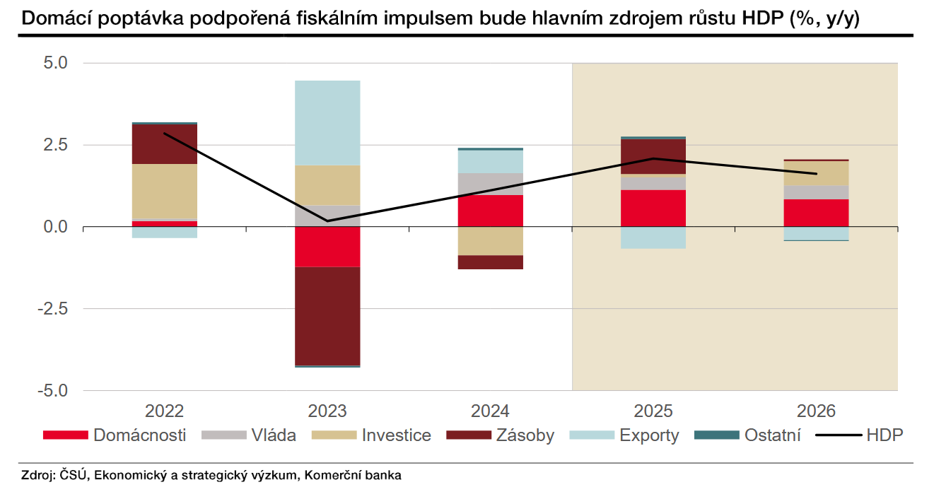 Růst pro rok 2026 ale přesto vidíme o zhruba půl procentního bodu silnější než před třemi měsíci. Důvodem jsou dosud prezentované záměry nové vlády ve fiskální oblasti, i když jsou zatím hodně nejasné. Naplňuje se náš rizikový scénář rozvolnění fiskálních pravidel. Pozitivní fiskální impuls by měl podpořit nejen domácí poptávku, ale i investiční aktivitu, která letos stojí hlavně na veřejném sektoru. Soukromé investice by se měly přidat v příštím roce.