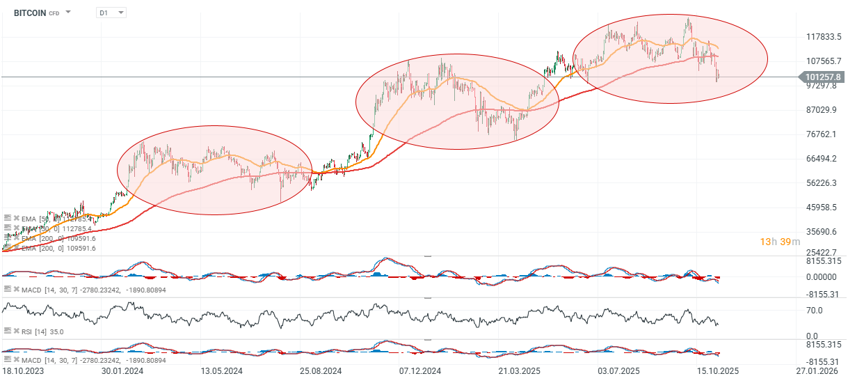 Na druhou stranu hloubka předchozích impulsů směrem dolů byla o něco větší, což by nyní znamenalo potenciální pokles směrem k 94 000 USD, což by fakticky vymazalo téměř všechny letošní zisky. Na základě analýzy price action a ukazatelů, jako jsou RSI a MACD, se podmínky na trhu zdají být přeprodané a klíčová úroveň krátkodobé podpory zůstává poblíž 100 000 USD, kde jsme již zaznamenali silnou nákupní reakci - dále posílenou podobným odrazem, který jsme zaznamenali v červnu.
