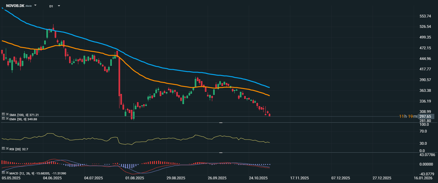 Akcie Novo Nordisk se aktuálně obchodují kolem hodnoty 297,65 DKK. Cena akcie je dlouhodobě v klesajícím trendu, přičemž se nachází pod EMA 50 (349,88 DKK) i SMA 100 (371,21 DKK), což potvrzuje pokračující medvědí náladu na trhu. RSI dosahuje hodnoty 32,7, tedy se blíží pásmu přeprodanosti, což může naznačovat možné krátkodobé zpomalení poklesu nebo pokus o technický odraz.