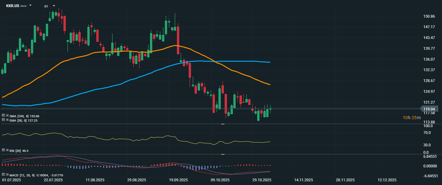 Akcie KKR & Co. se po několikatýdenním poklesu stabilizovaly kolem ceny 119,04 USD, ale zůstávají pod klouzavými průměry EMA 50 (127,25 USD) a SMA 100 (135,06 USD), což i nadále potvrzuje medvědí technické nastavení. RSI se aktuálně pohybuje na úrovni 40,4, což značí slábnoucí prodejní tlak, ale stále pod hranicí 50, která by signalizovala převahu kupců.