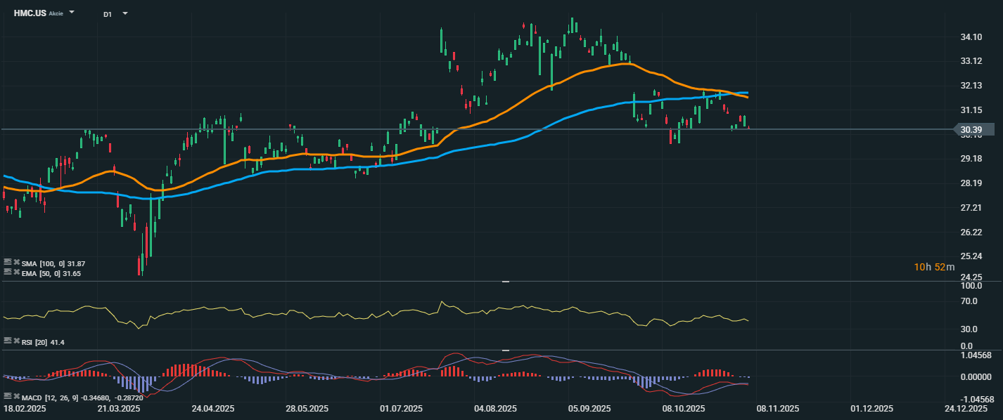 Akcie Honda Motor aktuálně oslabily na úroveň 30,39 USD, čímž se dostaly pod tlak po zveřejnění sníženého výhledu zisku. Cena akcie se propadla pod klouzavé průměry EMA 50 (31,65 USD) a SMA 100 (31,87 USD), což značí změnu sentimentu ve prospěch prodejců a potenciální nástup korekční fáze. RSI se nachází na hodnotě 41,4, tedy pod neutrální úrovní 50, což potvrzuje slábnoucí nákupní zájem.