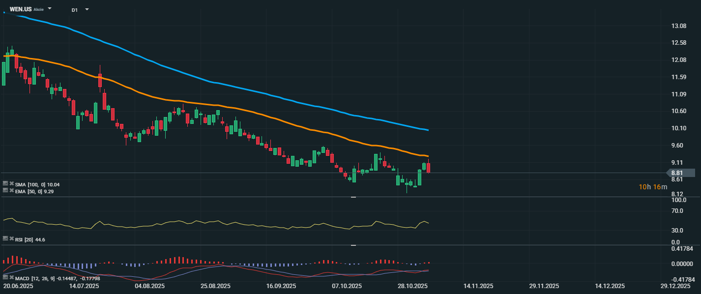 Akcie Wendy’s se po zveřejnění lepších než očekávaných výsledků dostaly do mírného růstového pohybu a aktuálně se obchodují na úrovni 8,81 USD. I přes krátkodobé zlepšení zůstává celkový trend jasně medvědí, což potvrzuje fakt, že cena se nadále drží pod klouzavými průměry EMA 50 (9,29 USD) a SMA 100 (10,04 USD). RSI se aktuálně nachází na hodnotě 44,6, tedy pod neutrální hranicí 50, což ukazuje na stále slabé, ale zlepšující se momentum.