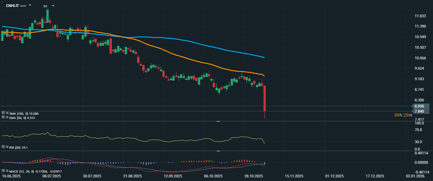 Akcie společnosti CNH Industrial se po zveřejnění sníženého výhledu zisku a slabších výsledků prudce propadly a aktuálně se obchodují na ceně 8,05 EUR, což představuje výrazný denní pokles o více než 12 %. Z technického hlediska se cena akcie nachází hluboko pod klouzavými průměry EMA 50 (9,31 EUR) a SMA 100 (10,08 EUR), což potvrzuje dlouhodobě negativní trend. RSI klesl na úroveň 24,1, tedy hluboko do přeprodaného pásma, což sice značí extrémní stav, ale v takto silně negativním sentimentu to nemusí znamenat okamžitý obrat.