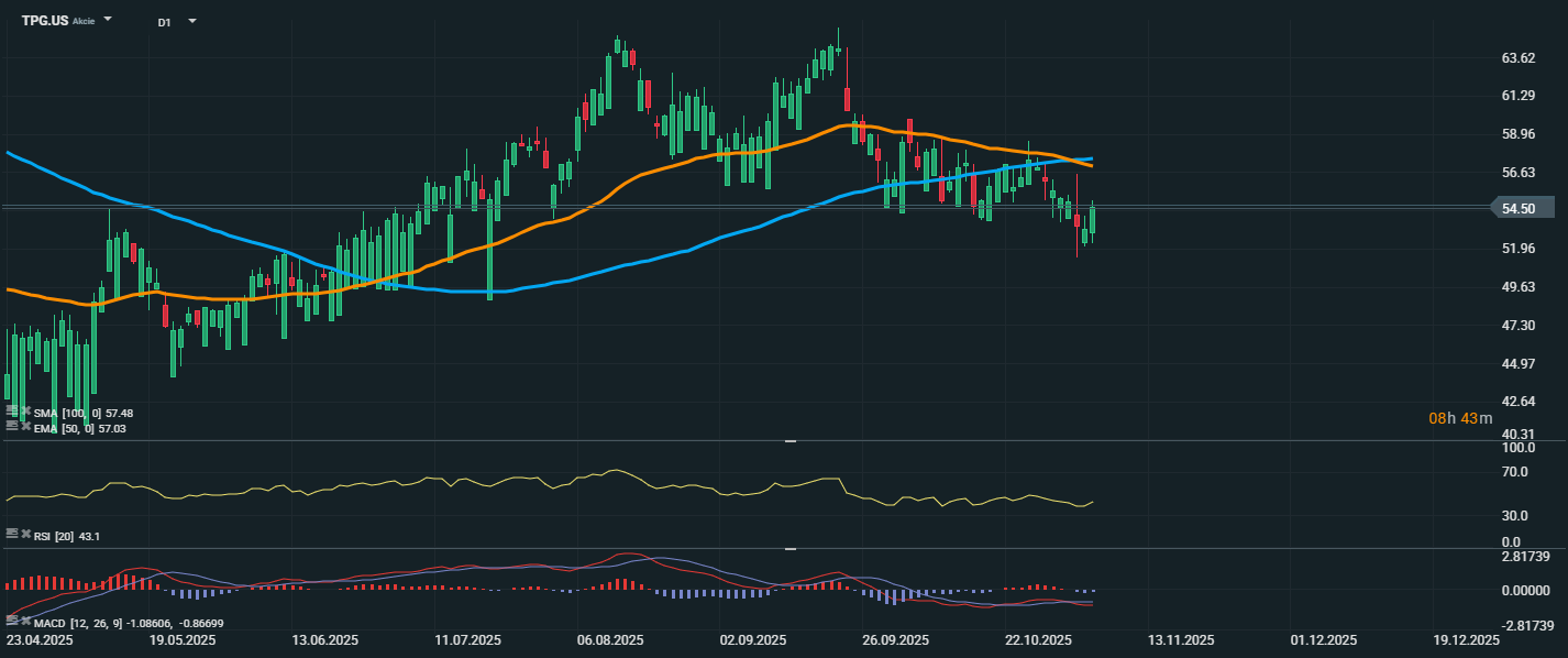 Akcie TPG se po krátkodobém poklesu odrazily a aktuálně se obchodují na ceně 54,50 USD. I přes mírný růst zůstává cena pod klouzavými průměry EMA 50 (57,03 USD) a SMA 100 (57,48 USD), což značí, že trend je zatím slabě medvědí. Průraz zpět nad tyto průměry by mohl být signálem pro býčí obrat. RSI se nachází na úrovni 43,1, tedy stále v neutrálně negativním pásmu.