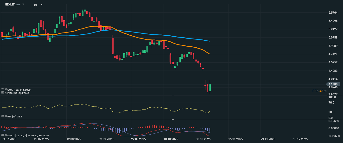 Akcie Nexi reagovaly pozitivně na zprávu o závazné nabídce TPG, když se odrazily z nedávných minim a aktuálně se obchodují na 4,14 EUR. Přesto zůstávají hluboko pod EMA 50 (4,74 EUR) a SMA 100 (5,00 EUR) – tedy stále v jasném klesajícím trendu. RSI na úrovni 32,4 značí přeprodaný trh, což mohlo podpořit krátkodobý odraz.