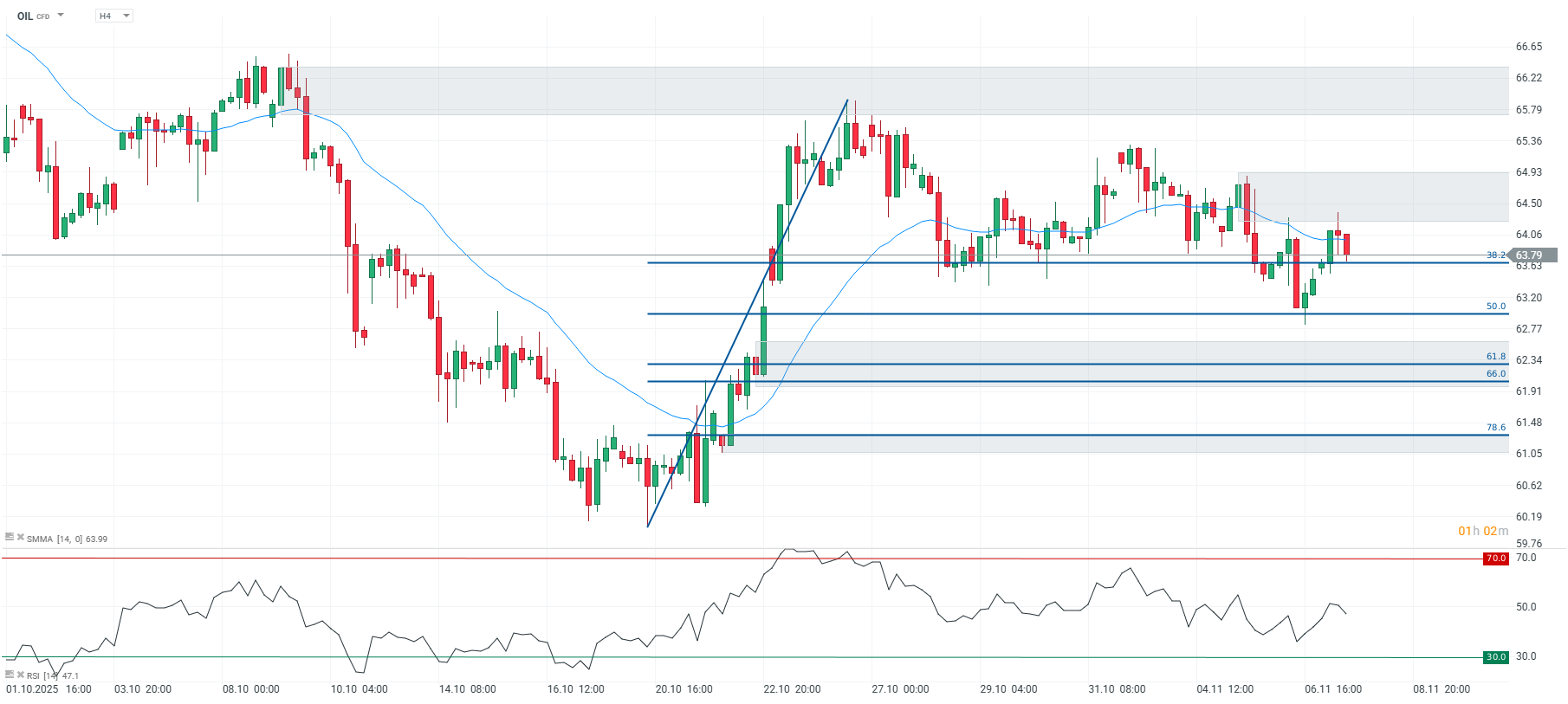Když se podíváme na graf z pohledu technické analýzy. tak si můžeme všimnout, že se cena ropy Brent už několik dní pohybuje v rangi s mírným medvědím směrem. Aktuálně se odrážíme se silné supply zóny, která prorazila lokální minima a způsobyla momentum dolů. Co se týká levelů pod náma, kam se cena klidně může podívat, tak jako první reakční je demand se nachází na úrovni 62$. Zde kromě demandu, ze kterého nastala impulsivní svíčka, se tu vyskytuje i 61.8 a 66.0 Fibonacciho retracementu. Toto bude důležitá úroveň ,ze které bychom mohli očekávat bullish reakci.