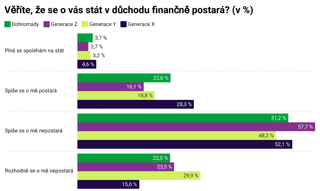 Ve schopnost státu postarat se o ně v důchodu věří výrazně více starší lidé z generace X (45–60 let). Třetina z nich (32,9 %) státu v tomto ohledu důvěřuje nebo spíše důvěřuje, zatímco jen 15 % je přesvědčeno, že se o ně stát finančně rozhodně nepostará. U generace Y (29–44 let) je skeptiků výrazně více – až 30 %. Nejmladší generace Z (18–28 let) je v tomto ohledu o něco optimističtější, státu nedůvěřuje 23,5 % dotazovaných. Na druhou stranu plně na stát spoléhá jen 2,7 % lidí z této věkové skupiny.