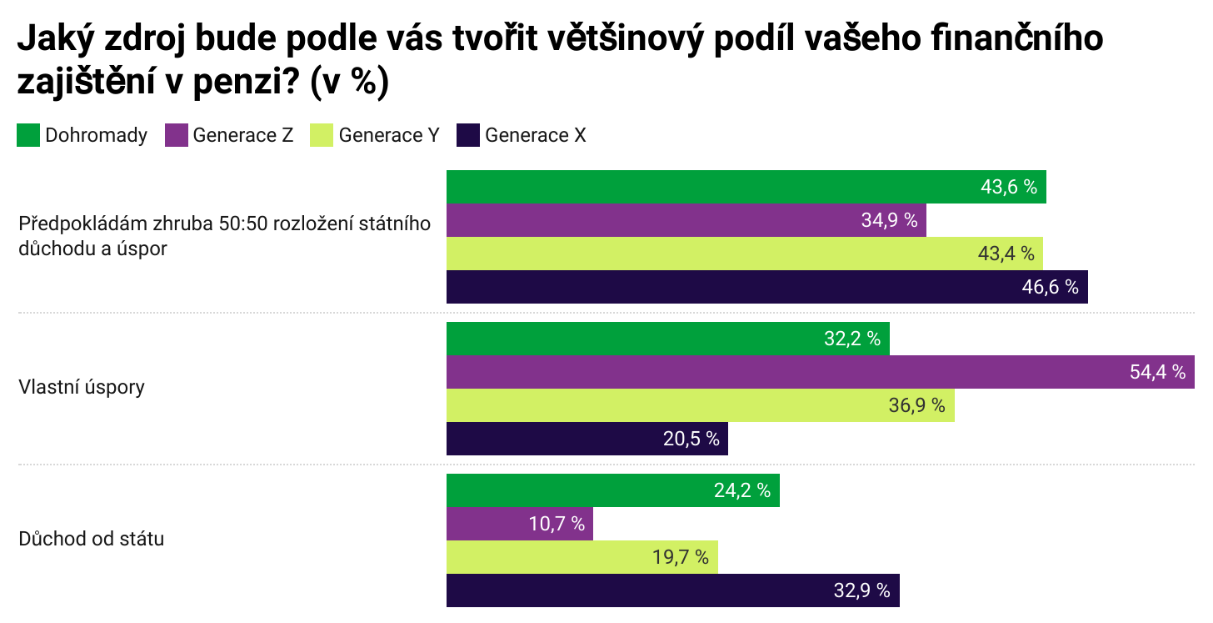 Pouze 26,3 % respondentů v Česku věří, že se o ně stát bude schopen alespoň do určité míry v důchodu postarat, na Slovensku je to 20 %. Mnozí si proto uvědomují, že si na důstojné stáří musí spořit sami. Téměř čtvrtina (24,2 %) dotázaných přesto očekává, že státní důchod bude tvořit většinu jejich finančního zabezpečení. I zde však důvěra ve stát s věkem výrazně klesá – zatímco 32,9 % generace X počítá s tím, že bude v penzi žít hlavně ze státního důchodu, u generace Z je to pouze 10,7 %. U vlastních úspor je situace opačná a mladší respondenti se na ně spoléhají výrazně více než ti starší. Celých 55 % respondentů z generace Z předpokládá, že většinu jejich finančního zajištění ve stáří budou tvořit osobní úspory.